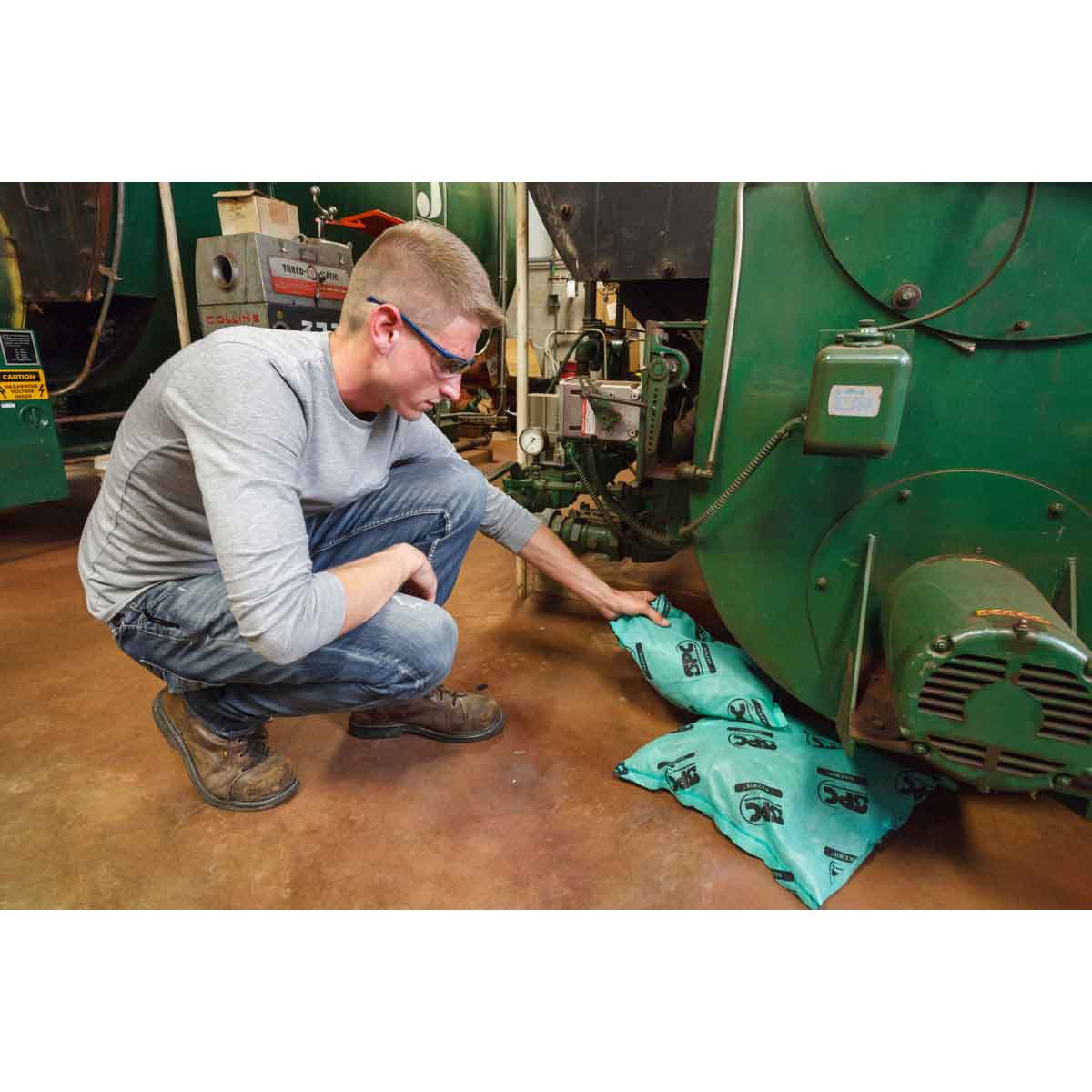 Chemische vloeistoffen absorberend kussen gevuld met grijs polypropyleen voor het absorberen van industriële vloeistoffen zoals olie, water, oplosmiddel, koelvloeistof enz. Perfect voor het absorberen van gemorste en lekkende vloeistoffen in nauwe ruimten of bij aanhoudende lekken.